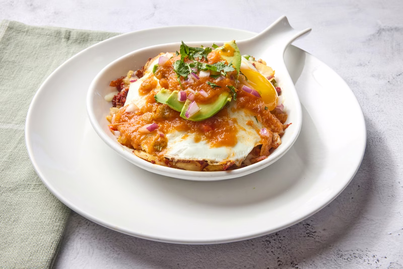 Corn tortilla chips sauteed with red or green sauce, topped with two eggs, Jack cheese, red onion, cilantro and sour cream. Choice of shredded chicken, carne asada, or beef barbacoa.
