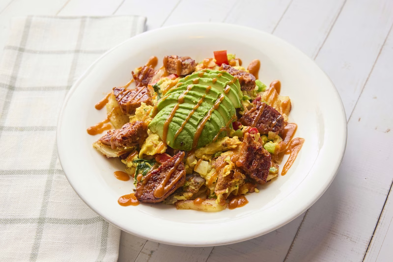 JUST Egg™ scrambled with spinach, mushroom, onion, red and green bell pepper, served over home fries and topped with BEYOND SAUSAGE® hot link, avocado, and sriracha.