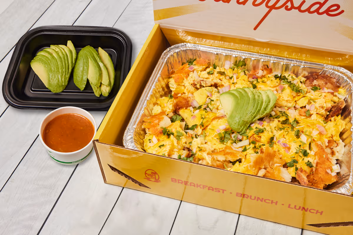 Home fried potatoes sautéed with chorizo, fresh chopped serrano peppers and onions. Topped with Jack cheese, scrambled eggs, avocado, red onion, cilantro and ranchero sauce. 365 cal